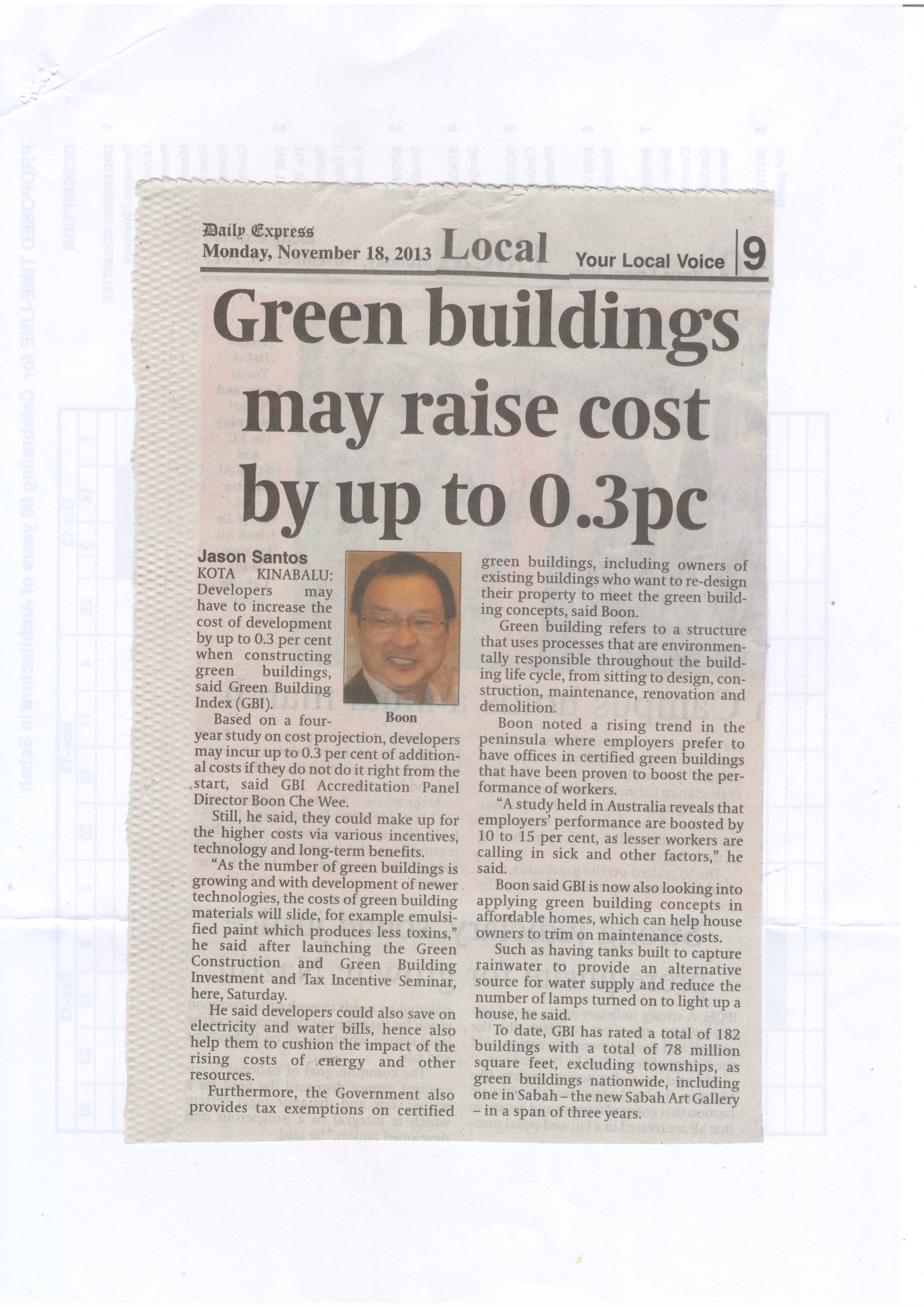 KOTA KINABALU: Developers may have to increase the cost of development by up to 0.3 per cent when constructing green buildings, said Green Building Index(GBI).
